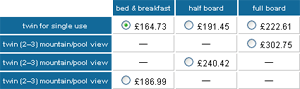 Accommodation results are displayed in a grid format of room type against board. This is designed to make it easy for agents to upsell on room or board for any given accommodation.